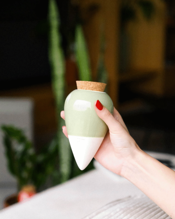 Deluje po principu “olla”. Keramika je obdelana s preciznim postopkom žganja, ki zagotavlja trpežnost in poroznost materiala, kar pomeni, da voda lahko prehaja skozi njene stene. Ko v vlažilko prsti nalijemo vodo, se keramika rahlo navlaži, osmoza pa omogoči, da vlaga postopoma doseže korenine. Pretok vode se samodejno prilagaja potrebam vsake posamezne rastline, zato bodo rastline vedno ravno prav zalite. Z enim polnjenjem lahko rastlino na tak način pasivno zalivamo do deset dni, odvisno od njenih potreb. Vlažilka prsti je opremljena tudi s pokrovčkom, ki preprečuje izhlapevanje in tako še dodatno izboljšuje učinkovitost sistema.