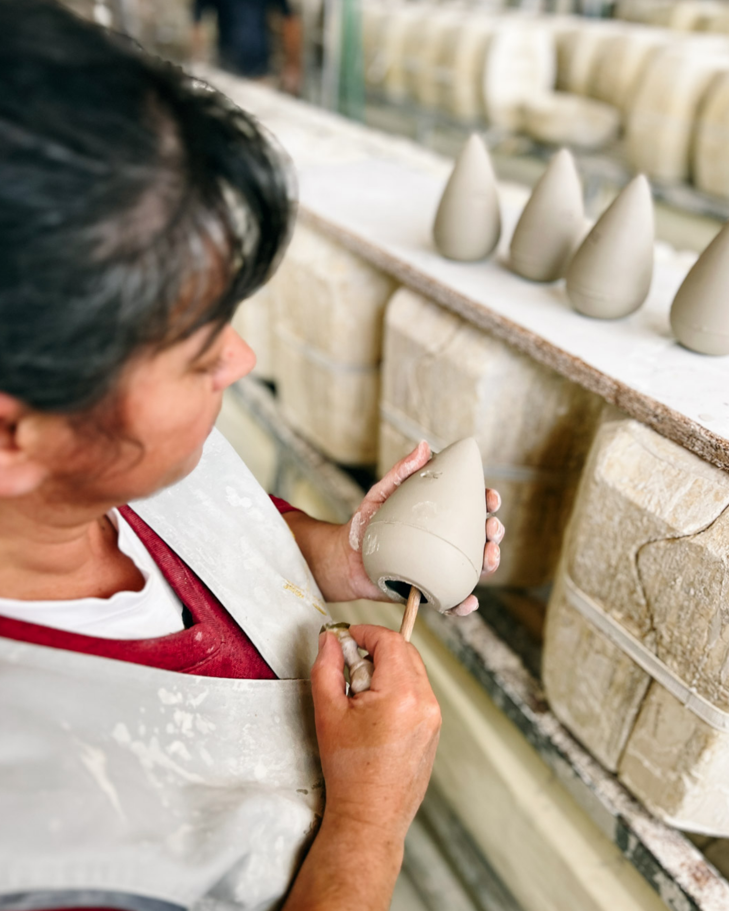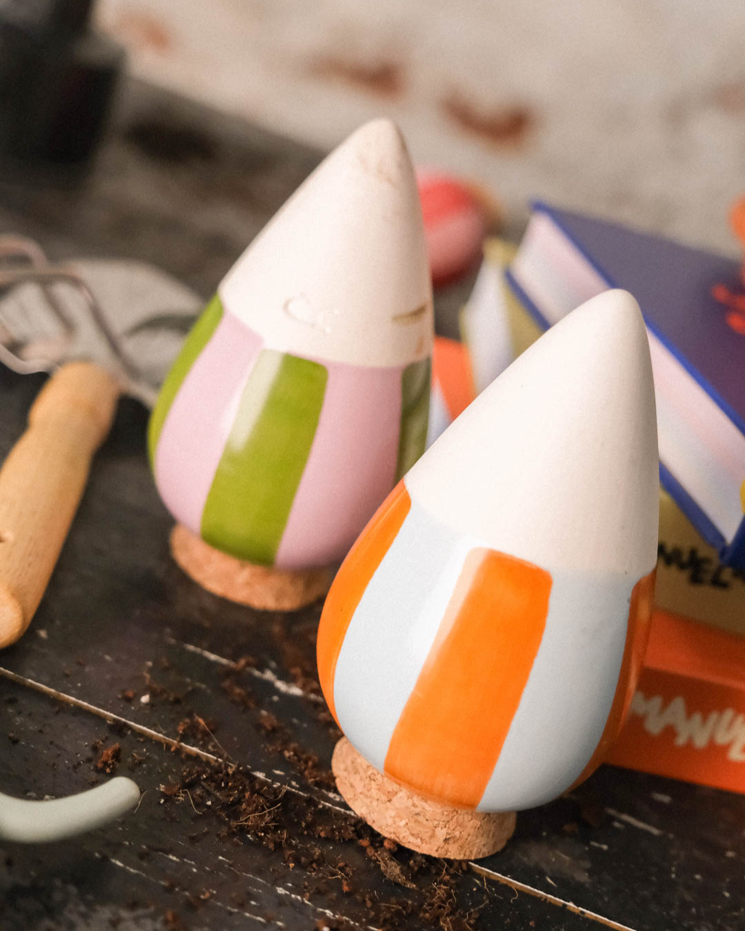 Izdelava: Vlažilke prsti Olla Pepin – Oranžnomodra so ročno izdelane na Portugalskem, blizu Leirije, v delavnicah Ane in Vitorja, kjer z glino delajo že štiri generacije. Korki izvirajo iz gozdov hrasta plutovca in se obdelujejo v Franciji. Uporabljeni materiali so popolnoma reciklabilni in obnovljivi.