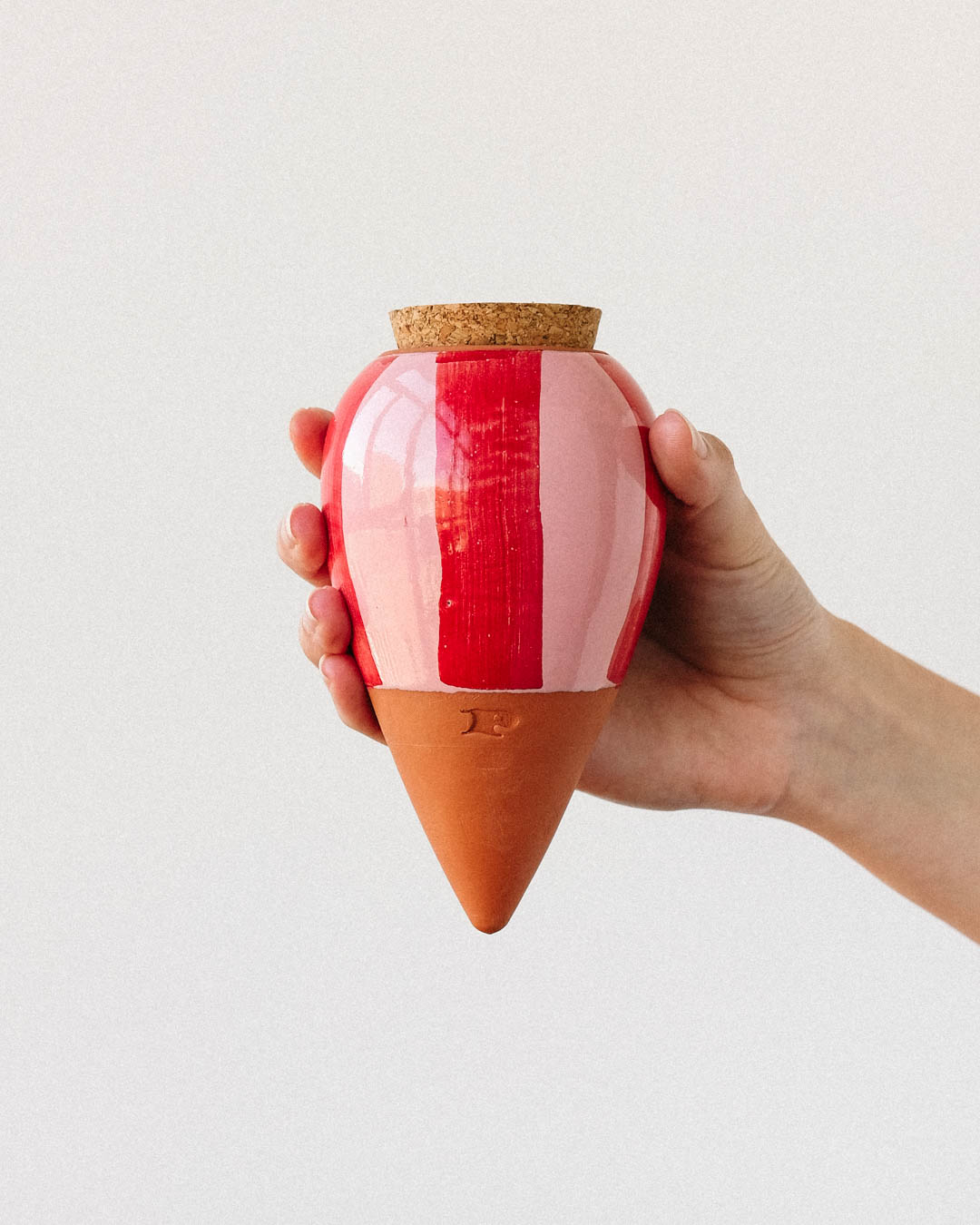 Olla Pepin – Rdečeroza je ročno izdelana vlažilka prsti iz mikroporozne keramike, ki zagotavlja avtonomno in postopno zalivanje sobnih rastlin. Vedno zagotavlja ravno pravšnjo količino vode in poskrbi, da se rastline razvijajo v močne in lepe primerke.